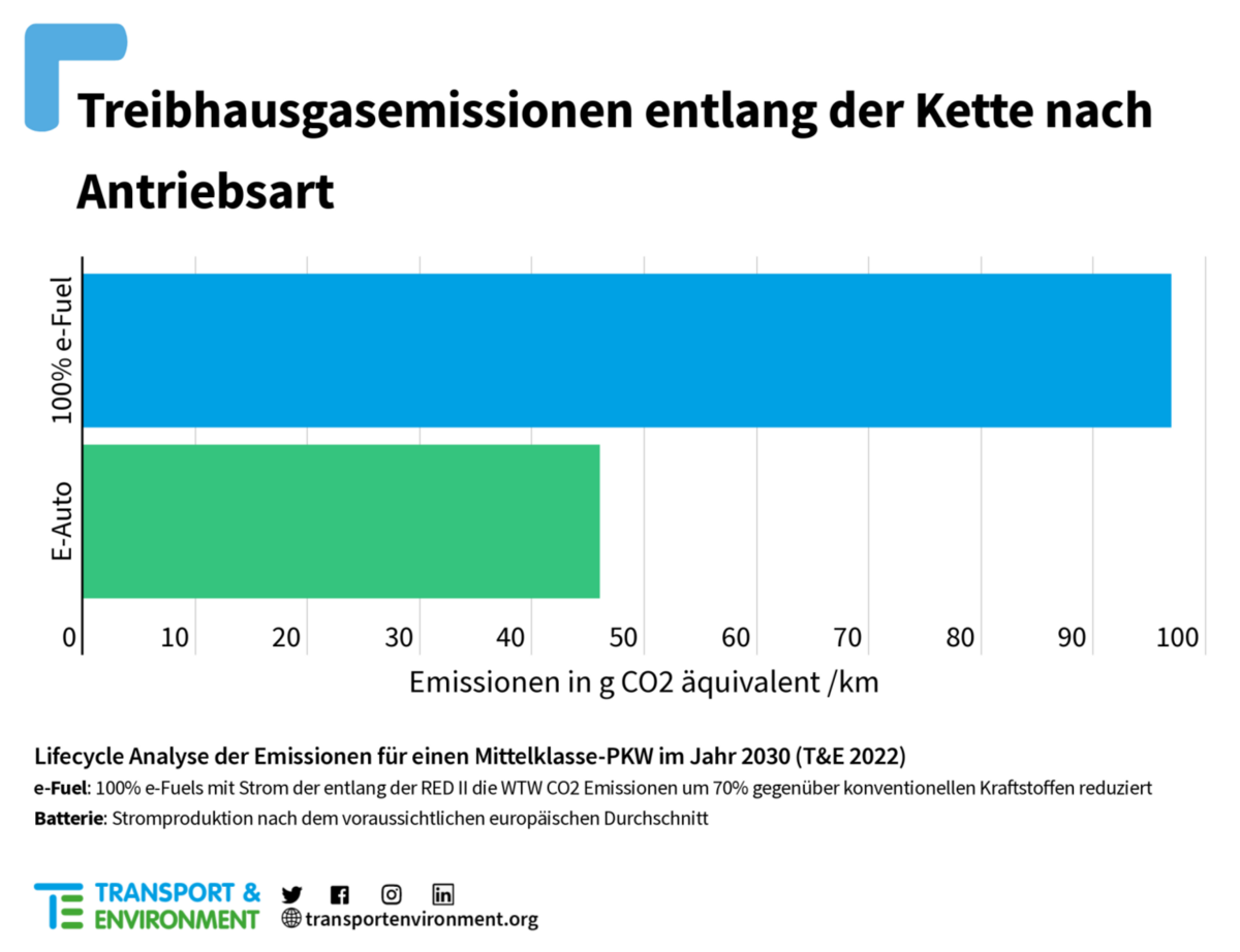 Ein Auto, das ausschließlich mit E-Fuels betrieben wird, wird über seinen Lebenszyklus fast doppelt so viel emittieren wie ein Elektroauto. Diese Analyse berücksichtigt den gesamten Lebenszyklus von Materialgewinnung, der Herstellung und Montage bis zur Entsorgung.2